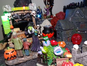 Since we moved to a new abode with MORE SPACE to put my Halloween Town, it’s a little different this year, with an entirely new section. Here’s this year’s photo: